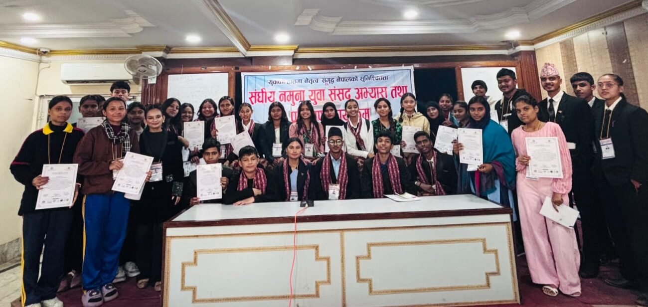 12 Dec शिक्षा, भर्खरै, समाचार, समाचार संघीय नमूना युवा संसद अभ्यास कार्यक्रम सम्पन्न : युवामा नेतृत्व, संसद सञ्चालन र लोकतान्त्रिक संस्कार विकास December 12, 2025 By Nepalgunj TV 0 comments २६, मंसिर २०८२ शुक्रबार बाँके - नेपालगञ्ज उपमहानगरपालिका स्तरीय युवा क्लब सञ्जालको आयोजनामा तथा नगरपालिकाको सहयोगसहित सेभ द च... Continue reading