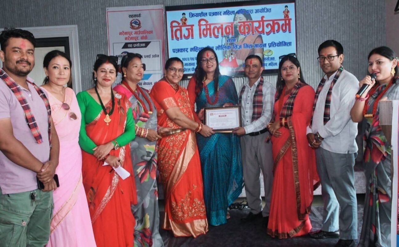 22 Aug समाचार, जीवनशैली, मनोरञ्जन, समाचार युनियनको तीज लेखनवृत्ति : लक्ष्मी विसी प्रथम, सात महिला पत्रकार सम्मानित August 22, 2025 By Nepalgunj TV 0 comments ०६ भदौ २०८२ शुक्रबार बाँके, नेपालगञ्ज - नेपाल प्रेस युनियन बाँकेले पत्रकार महिलाहरुका लागि आयोजना गरेको तीज व... Continue reading