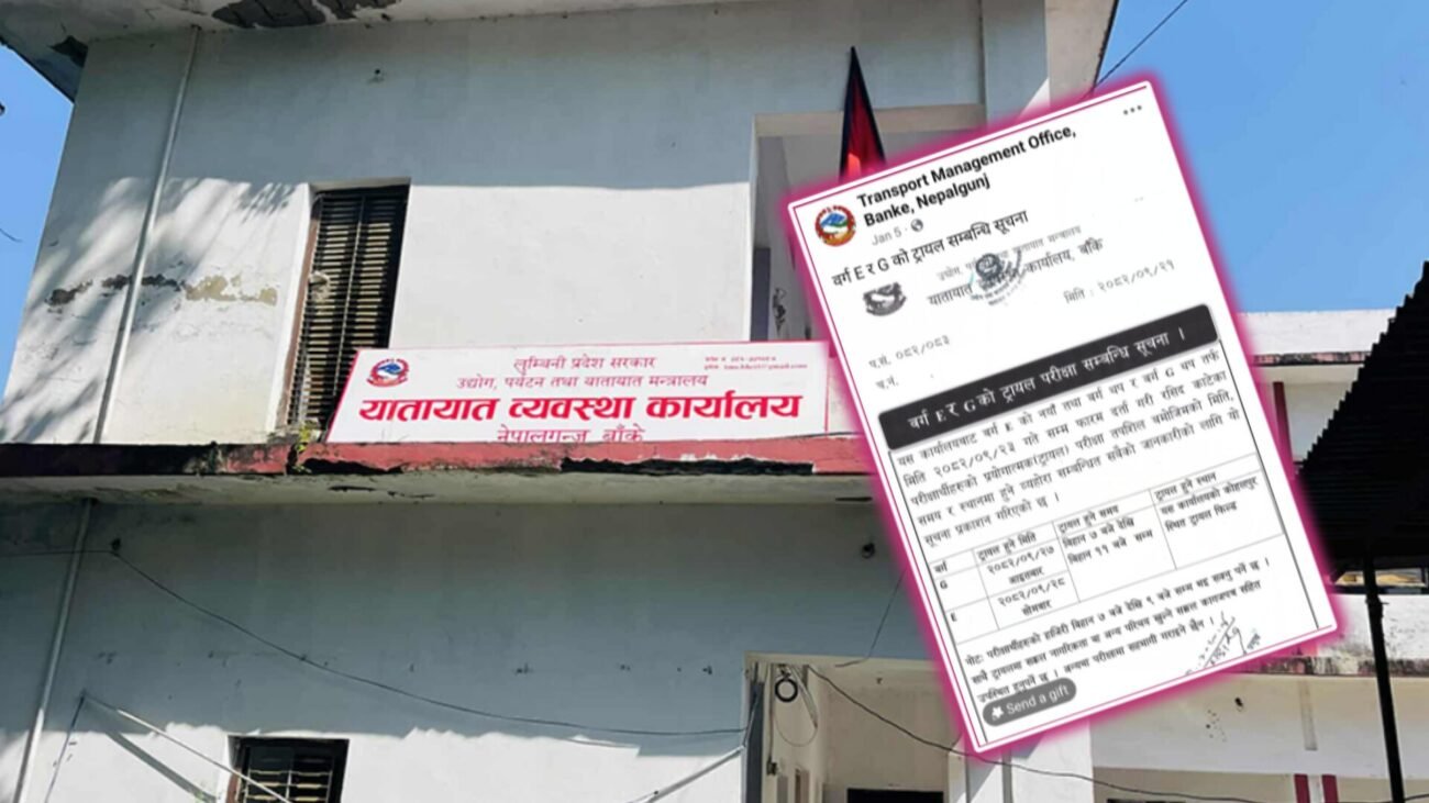 19 Jan समाचार, अन्य, भर्खरै, समाचार यातायात व्यवस्था कार्यालय बाँकेमा लाइसेन्स ट्रायलमा अनियमितताको आशंका, अनुसन्धान कसले गर्ने ? January 19, 2026 By Nepalgunj TV 0 comments ०५, माघ २०८२ सोमबार बाँके, नेपालगञ्ज - यातायात व्यवस्था कार्यालय बाँकेमा पौष २७ गते सम्पन्न हेभी लाइसेन्स ट्रायल तथा दैनिक रूपमा हु... Continue reading