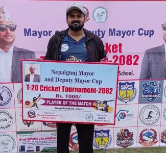 बाँके, नेपालगञ्ज – नेपालगञ्जमा सञ्चालन भइरहेको नेपालगञ्ज मेयर कप (पुरुष) क्रिकेट प्रतियोगिता अन्तर्गत भएको खेलमा नेपालगञ्ज च्याम्प्स ले प्रभावशाली प्रदर्शन गर्दै जयबागेश्वरी स्पोर्ट्स क्लब लाई ८५ रनले पराजित गरेको छ।
