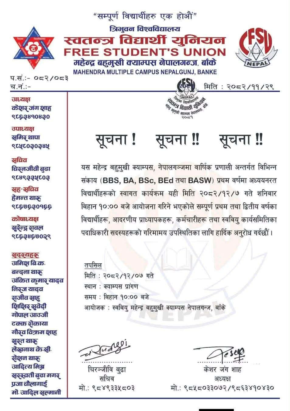 बाँके, नेपालगञ्ज — महेन्द्र बहुमुखी क्याम्पसमा चैत ७ गते आयोजना गरिएको स्वागत कार्यक्रमप्रति मुस्लिम विद्यार्थीहरूले कडा असन्तुष्टि जनाउँदै विरोध प्रकट गरेका छन्।