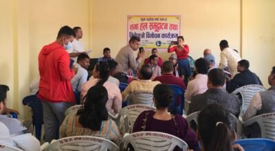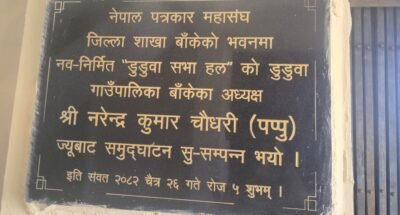बाँके, नेपालगञ्ज — नेपाल पत्रकार महासंघ बाँके शाखामा डुडुवा गाउँपालिकाको १० लाख रुपैयाँ आर्थिक सहयोगमा निर्माण गरिएको ‘डुडुवा सभा हल’ भव्य रूपमा उद्घाटन गरिएको छ। गाउँपालिका अध्यक्ष नरेन्द्र कुमार चौधरी (पप्पु)ले शिलालेख अनावरण तथा रिबन काटेर सभा हलको उद्घाटन गर्नुभयो।
